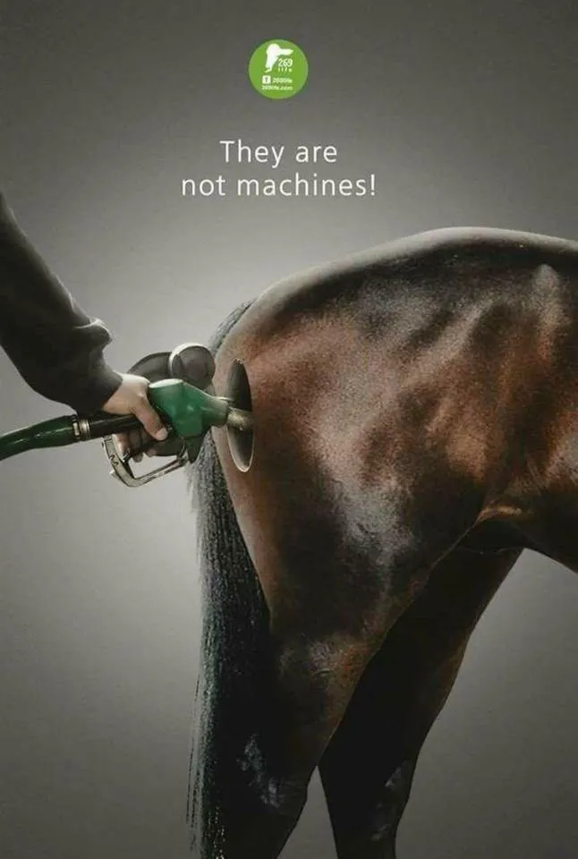 Une publicité signée par l’Association végane (un poil extrémisme à mon goût) 269 Life. Etant donné leur positionnement, j’imagine que le message s’adresse à TOUS les cavaliers – avec ou sans mors, pieds nus ou pieds ferrés…