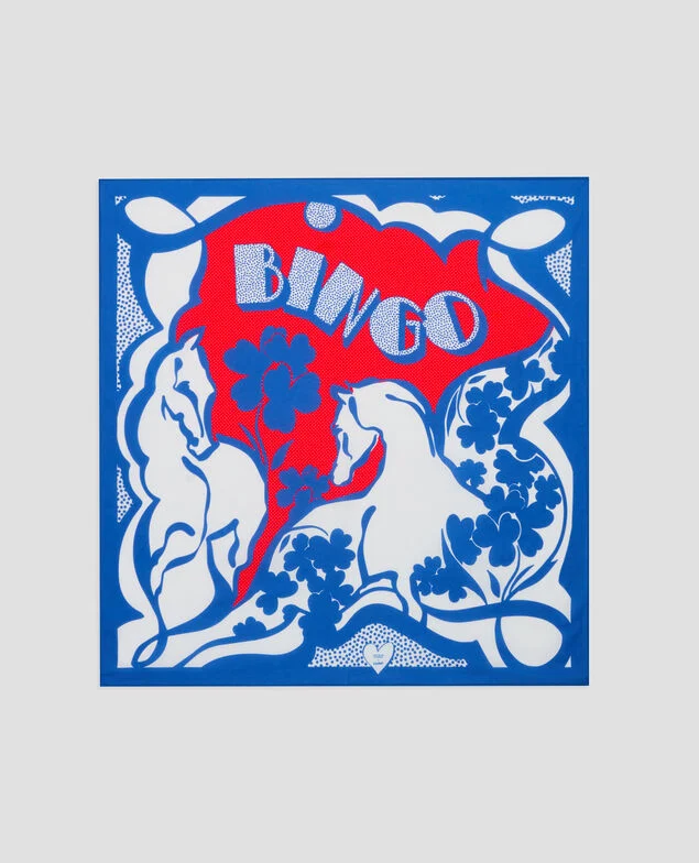 Pénélope Leprévost à propos de son imprimé précise : « Bingo, c’est mon cheval de compétition, représenté ici avec des trèfles à quatre feuilles porte-bonheur, le tout avec une touche à la fois pop et vintage, comme j’aime. »