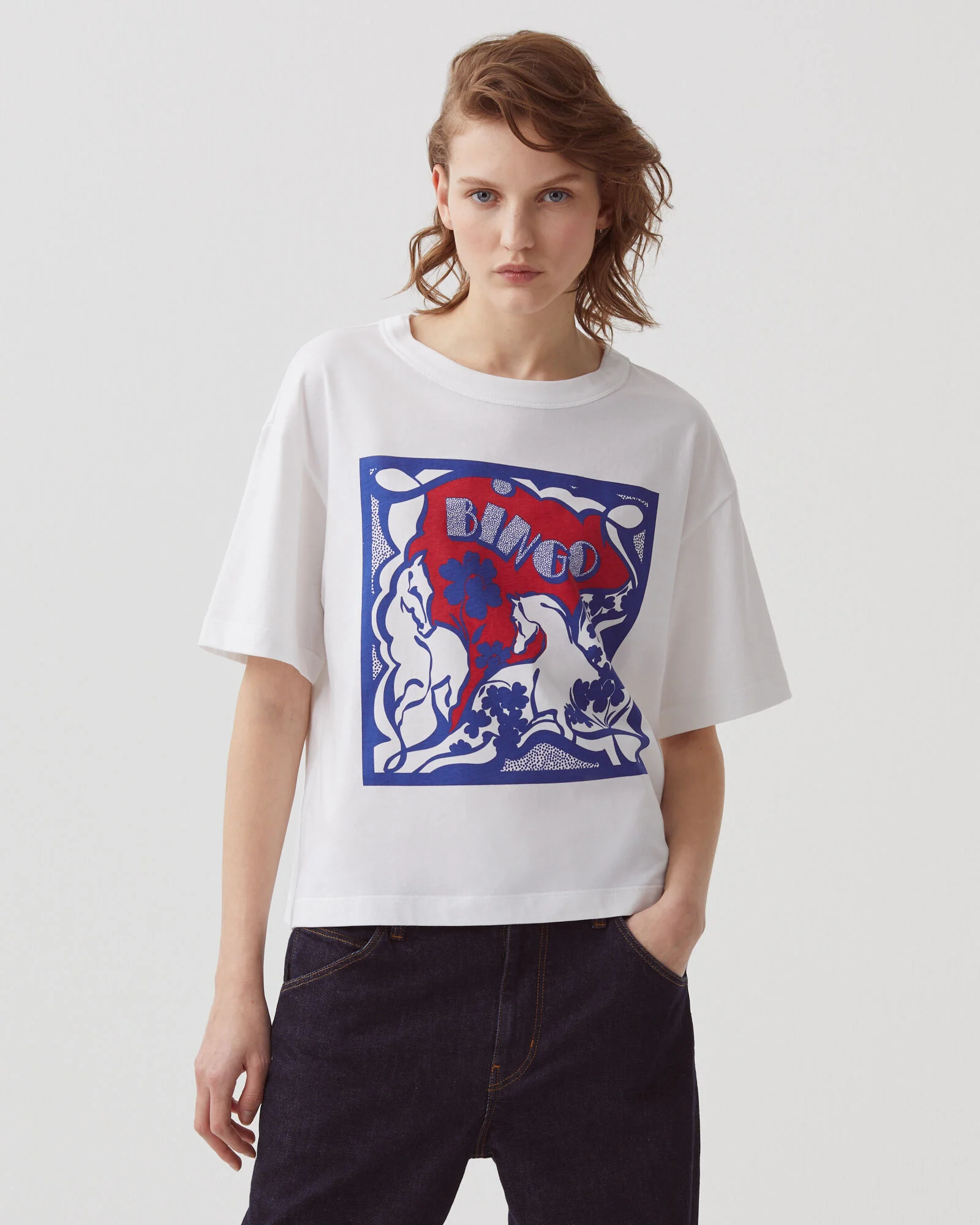 Le t-shirt, la pièce essentielle. Le design intègre un imprimé illustré. Celui de Pénélope Leprévost met en scène son cheval de tête, Bingo Del Tondou, avec qui elle était présélectionnée pour les Jeux olympiques de Paris. Il est entouré de trèfles à quatre feuilles porte-bonheur.