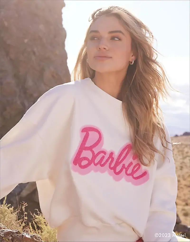 Les jeans, vestes en jeans, sweatshirts et t-shirts mêlent l’univers de Barbie avec une touche de western, notamment dans l’iconique poche arrière en cuir des jeans de Wrangler et dans une série d’imprimés multicolores. La chemise western de couleur “Dreamy Pink” accompagne élégamment cet ensemble et nous immerge directement au pieds des canyons du Far-West.