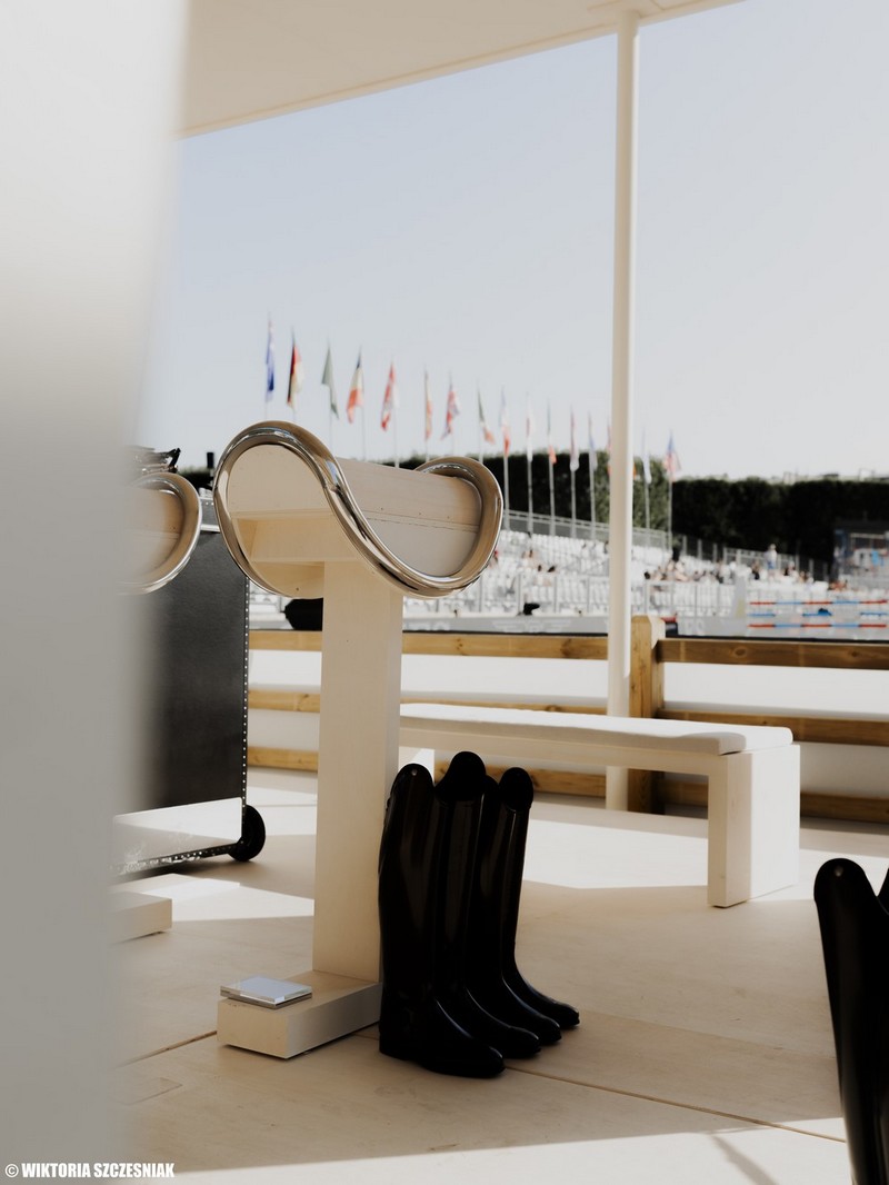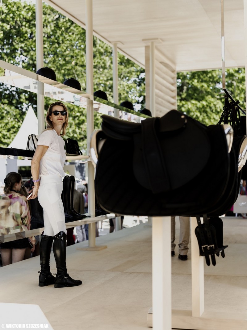 Depuis plusieurs années, le “LPEJ” (Longines Paris Eiffel Jumping, étape du Global Champions Tour) s’emploie à créer un village exposant avec des partenaires haut-de-gamme. Le pop-up store de Longines – partenaire titre – regorge de merch LPEJ. Cette année, c’est la capsule Saint-Laurent Rive Droite spécialement créée pour les cavaliers qui lui vole la vedette.